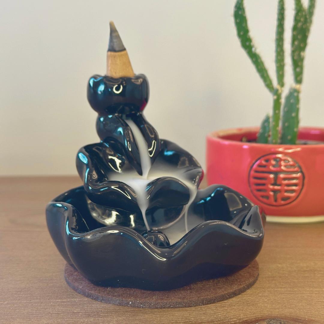• Don't 'ash' the incense cone. In other words, make sure that the ash on top of the cone stays in place. Without the ash in tact, the smoke will start flowing out of the top of the incense cone and will stop producing the backflow effect.